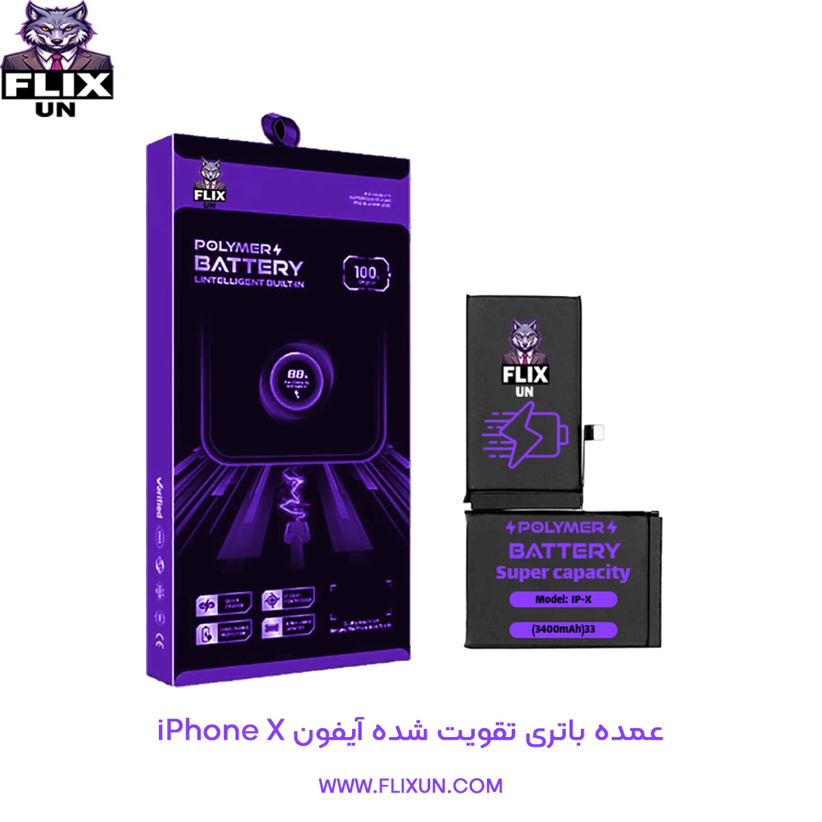 باتری تقویت شده گوشی آیفون iPhone X که توسط تولیدی فلیکسون برای افزایش کارایی و بهبود عملکرد این مدل از آیفون به تولید رسید، گوشی آیفون X که در سال 2017 تولید شد به علت داشتن ویژگیهایی مثل قابلیت شارژ بیسیم Qi (حداکثر 7.5W) و داشتن تراشه A11 Bionic با مصرف انرژی بهینهشده و طراحی جذاب به یکی از گوشیهای محبوب آن دوران تبدیل شد. بهطوریکه با وجود رونمایی محصولات جدیدتر نسبت به این مدل، برخی از کاربران هنوز هم از این گوشی و امکانات محدود آن استفاده میکنند. بااینوجود، این مدل در طی چند سال استفاده دچار مشکلات فنی زیادی شده است که یکی از آنها کاهش عملکرد باتری آن میباشد. برای افزایش توان دستگاه در اجرای برنامهها، شارژ سریعتر و افزایش درصد سلامت آن میتوان از باتریهای تقویت شده کمک گرفت. با این محصول کاربر میتواند مدت زمان بیشتری از گوشی نوستالژی خود استفاده کند؛ زیرا عملکرد آن ارتقا نسبت به قبل بهطورقابلتوجهی ارتقا یافته است.
